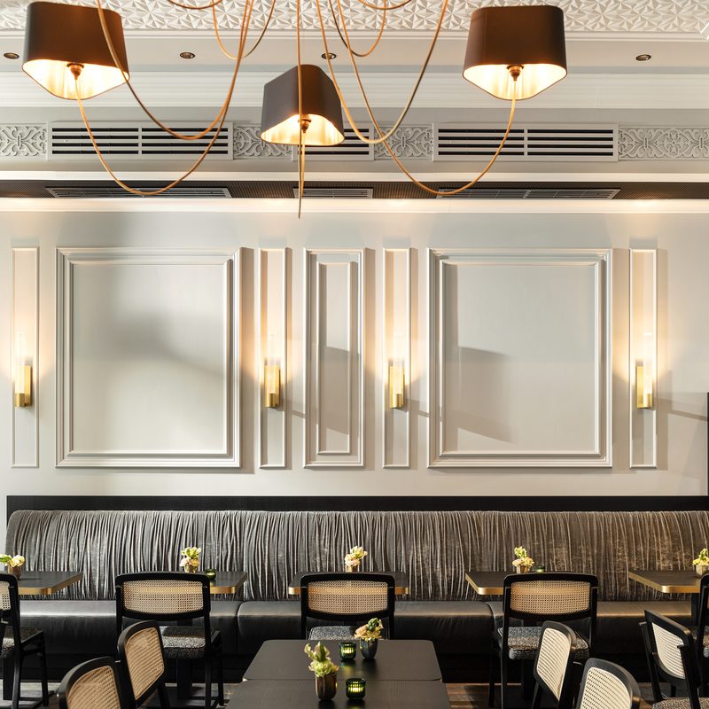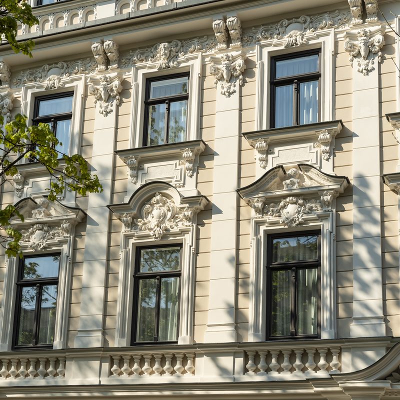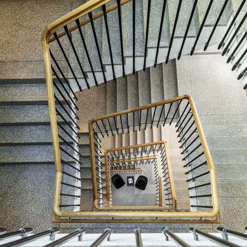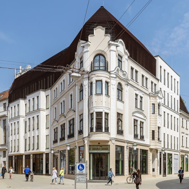 Bereits von außen sticht die Architektur des Gebäudes durch ihren Hybrid-Charakter hervor. Die unter Denkmalschutz stehende und frisch restaurierte neobarocke Fassade geht nahtlos in einen zeitlos modernen Neubau mit einer aufwendigen Dachkonstruktion über.
